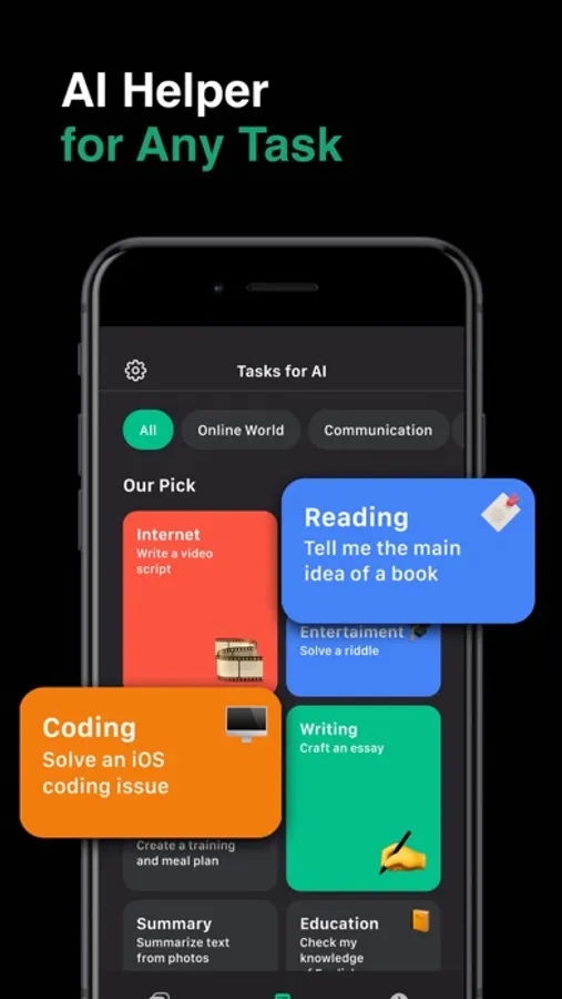 Simply type in your request, and the app will go through the tedious writing routine for you. Start generating creative content and upgrade your writing with our universal AI chatbot here and now!