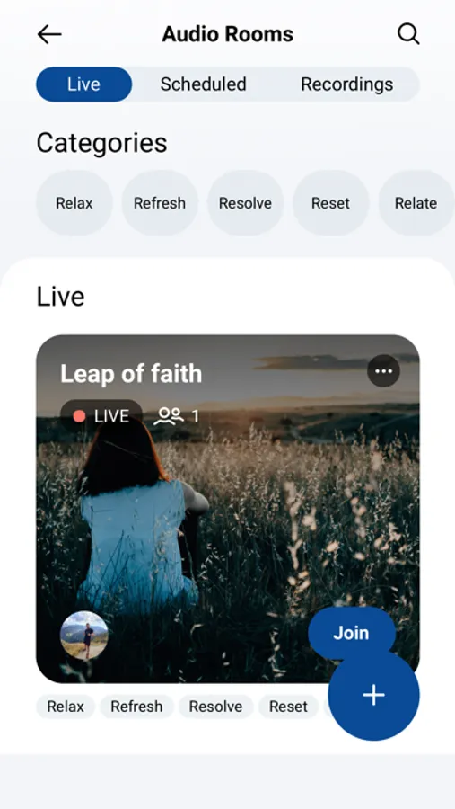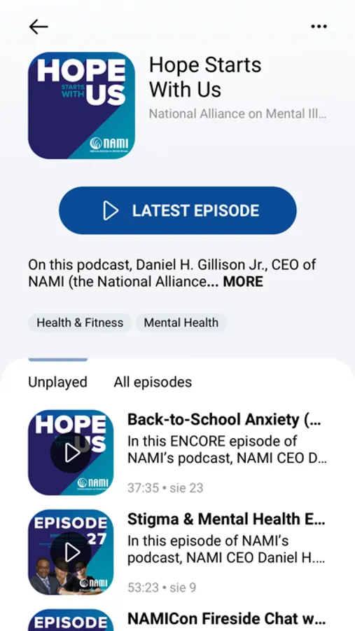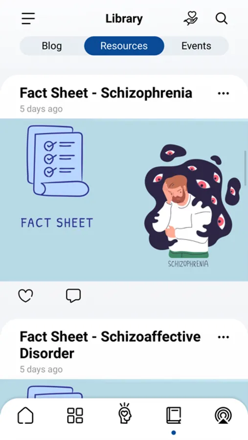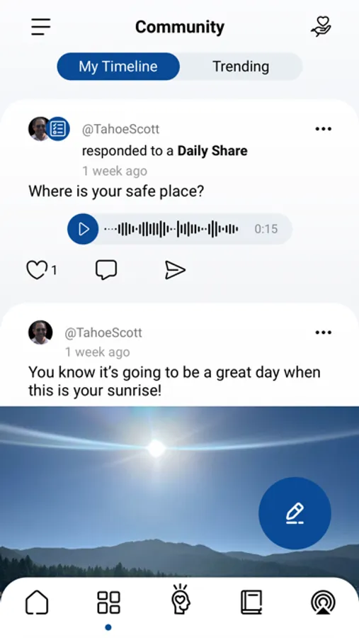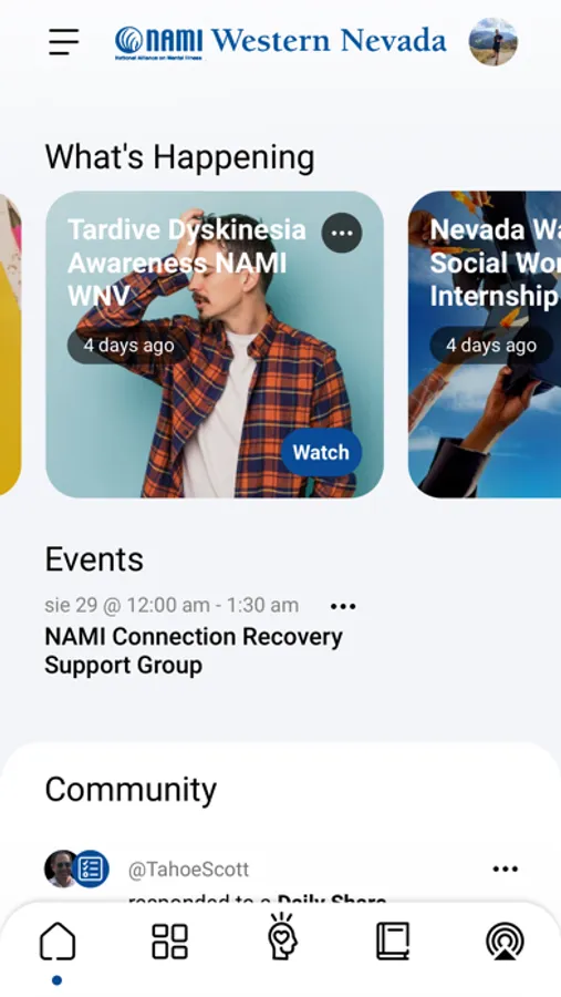 Through The NAMI WNV app, users are able to support one another by participating in Audio Rooms (either with their profile known or anonymously through the incognito mode), sharing moments on the Social Feed by posting images and video, sharing an audio response to one of the provocative Daily Share prompts (or the response may be kept in a private Audio Journal). Explore other in-app resources within the Library such as blog posts and inspirational video.