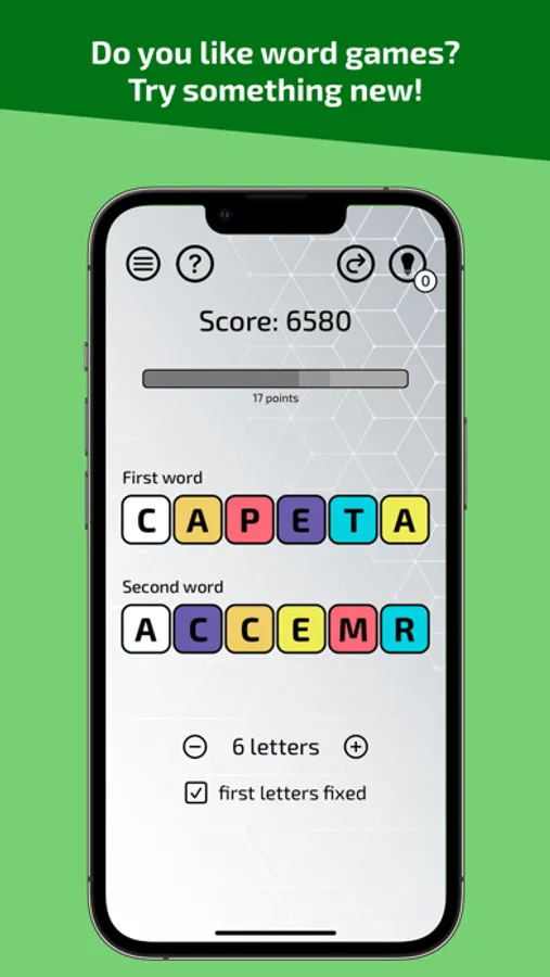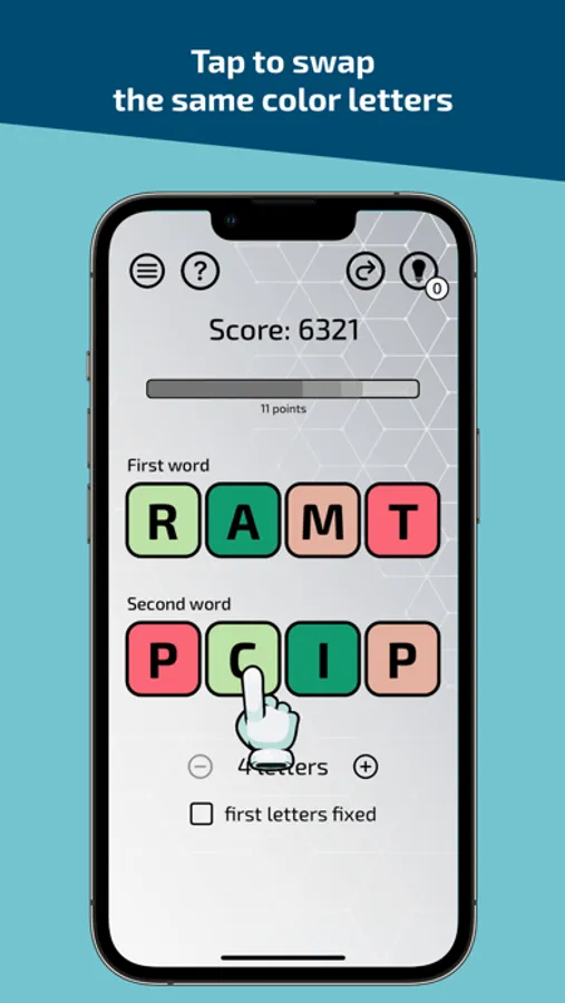 In Swaplette your task is to compose pairs of English words in which some letters are interchanged. Tap on the letters to swap their positions with letters of the same colour in the other word until both words are complete.