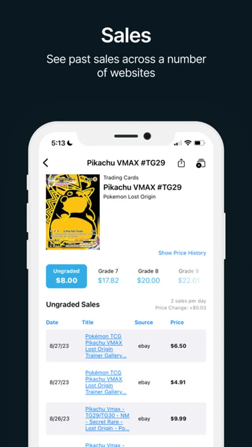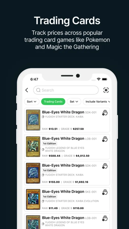 The best of PriceCharting and SportsCardsPro now on iOS! Find out what your collectibles are worth. Track market prices of video games, sports cards, Pokemon, YuGiOh, Magic the Gathering, Lorcana, and other trading cards, comic books, US coins, LEGO, and more. Completely free. We track thousands of sales from the top auction sites: eBay, Heritage, PWCC, and more, filter and sort them by condition into easy to use price guides.