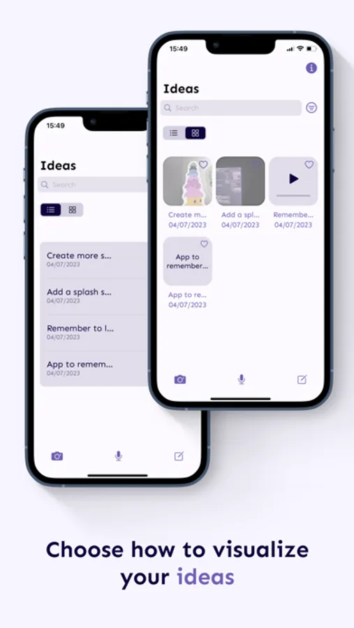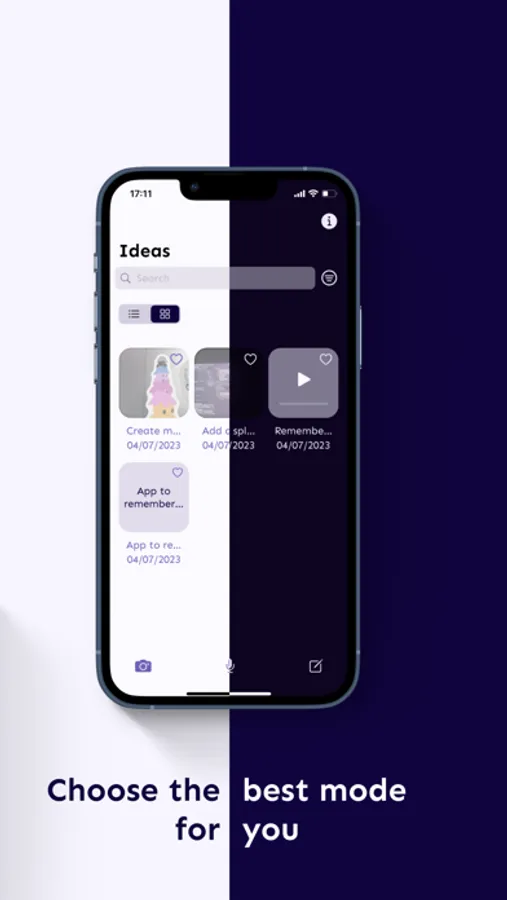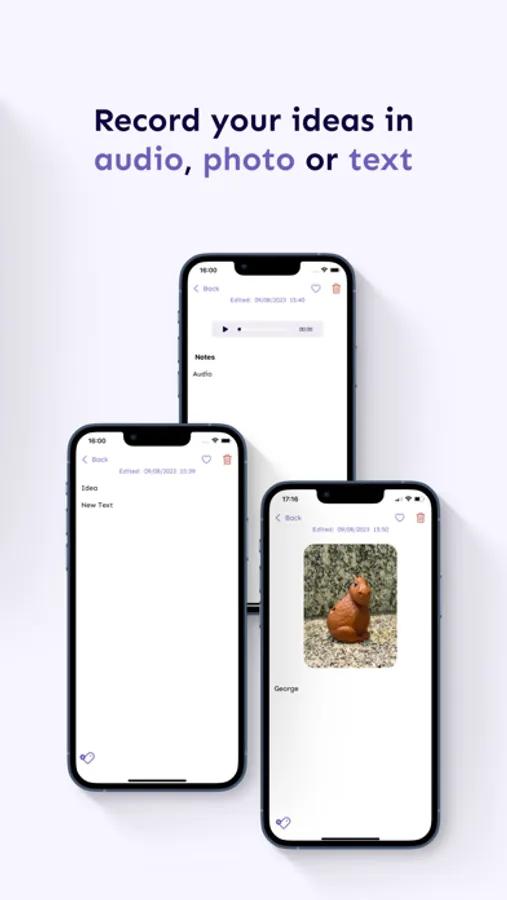 Capture all your ideas in one place easily, with Ideeo you can record ideas in text, audio, and photos. As well, you can categorize your ideas with tags and decide which ones are your favorites. Don't worry if the list of ideas gets too long, you can search by title, content, and category and you can also filter the idea by the type you want, be it photo, text or audio.
