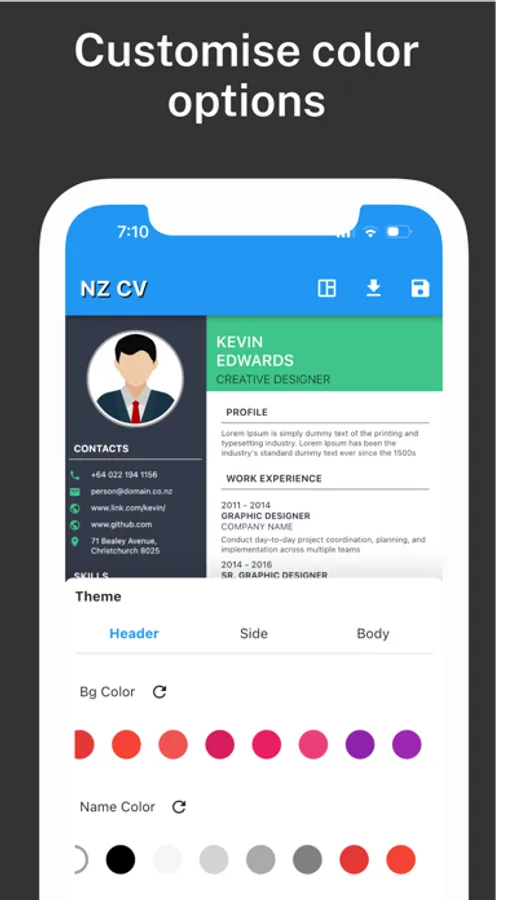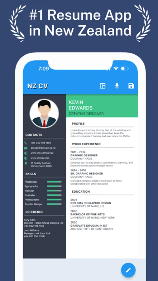 Are you applying for a job in New Zealand and don't have any idea how the CV should look like? NZ CV - New Zealand resume app helps you to create a modern and perfect CV for your upcoming job application. Choose from the pre-built resume templates and edit the details you want to change. Save the CV and send them in PDF format. You can also email the newly created PDF directly from the app. If you are connected to a Wi-Fi printer, you can make a hard copy of your resume as well.