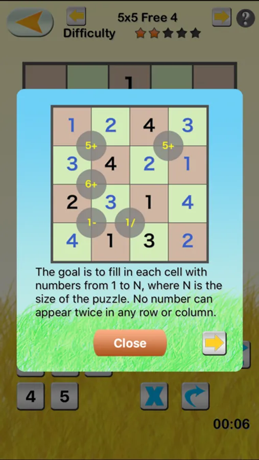 Mathrax is a logic puzzle. The goal is to fill in each cell with numbers from 1 to N, where N is the size of the puzzle's side. No number may appear twice in any row or column. Circles with additional conditions may appear on intersections of lines inside the grid.