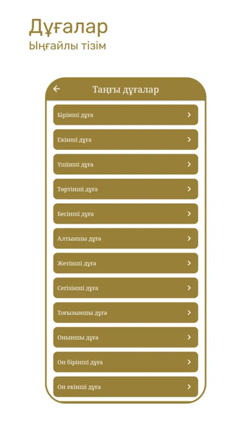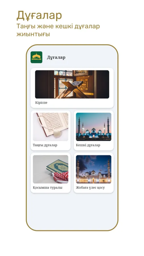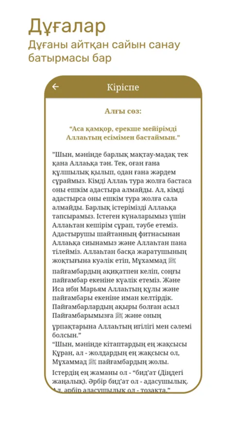 Мобильді қосымшада таңғы және кешкі дұғалар жинақталған. Сонымен қатар дұғаны айтқан санайтын арнайы санақ батырмасы бар. Тексттер арабша және қазақша аудармасымен жазылған.