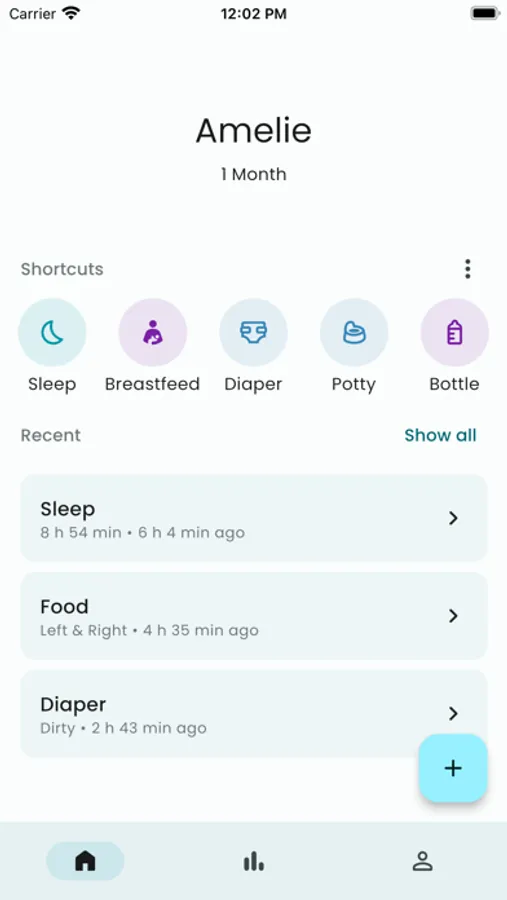 - Track sleep, breastfeeding, bottle, solid, diapering, and growth