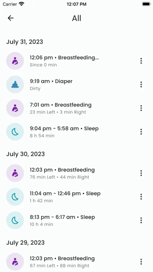 - Access the entire timeline or filter for food, sleep, diaper, or growth