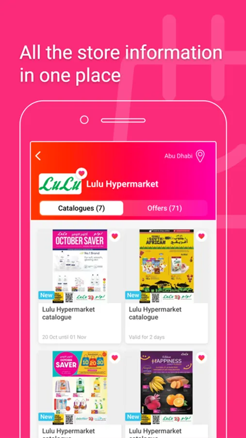 Our Promotions.ae app shows you all the current catalogues from small and large chain stores in the United Arab Emirates, and not just the grocery stores and supermarkets, but also electronics stores, fashion stores, dept. stores, toy stores, pharmacies and many more. We have even included most of the local stores. Do you want to select a store as a favorite, you can simply do this by clicking on the love heart. This way you will always be the first to know about any promotions that are going at your favorite stores, and you will have created a handy collection of all your favorite catalogues.