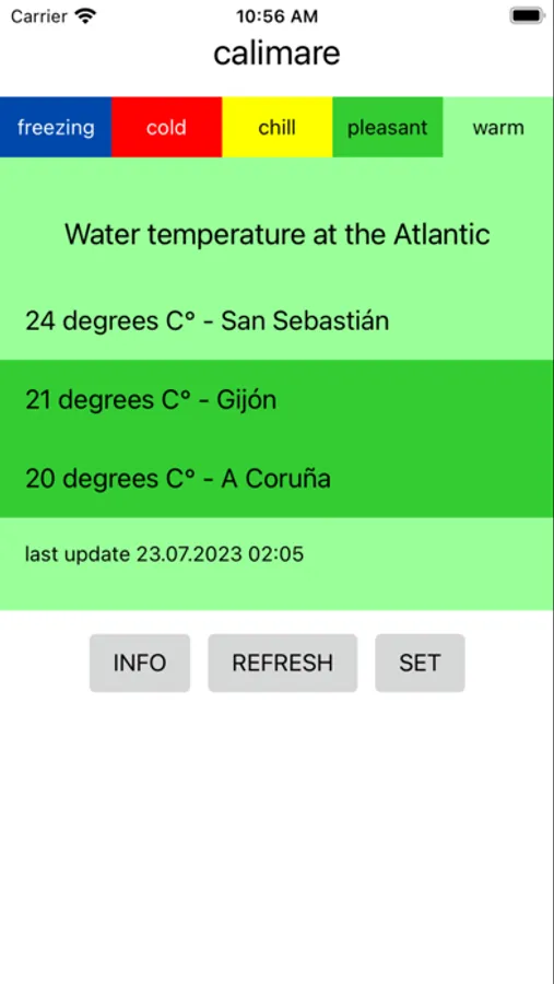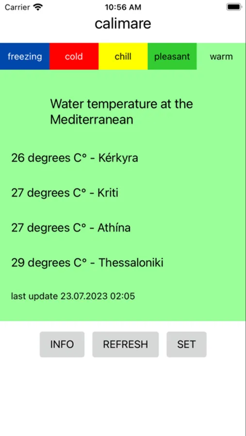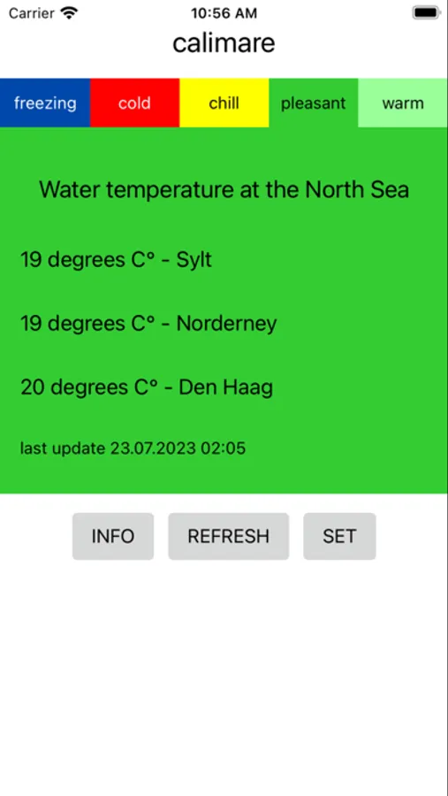 The app delivers daily updated the current water temperature of European oceans and seas. Currently it features the water temperature of of parts of the Baltic Sea, the North Sea, the Channel, the Atlantic and the Mediterranean.