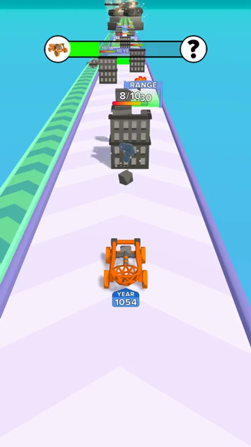 As you traverse, your catapult becomes your trusty companion, shooting at the looming structures ahead. Each building you encounter comes with its own health, and your precise shots will demolish pieces of it, leaving a trail of destruction in your wake. Behold the captivating cutscene, triggered by a slider on the left of the runway, where the magic of time unfolds before your very eyes!
