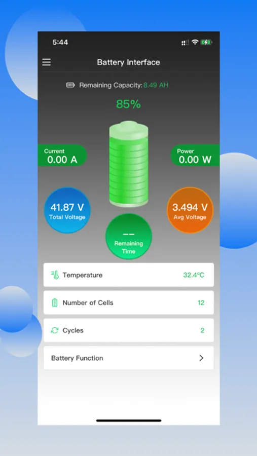 2) Displays detailed battery operating information on the Battery Interface tab including : State of Charge Percentage, Status, Voltage, Current, Temperature, Cycles and so on.