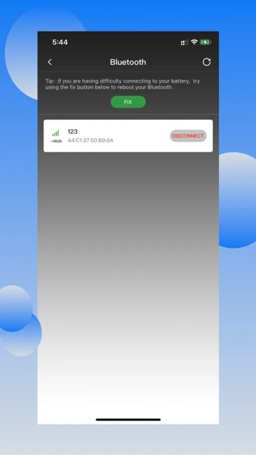 7) APP will list batteries within signal distance on the Bluetooth tab, and you choose which one you want to view. You may disconnect and connect to another battery on the Bluetooth page.