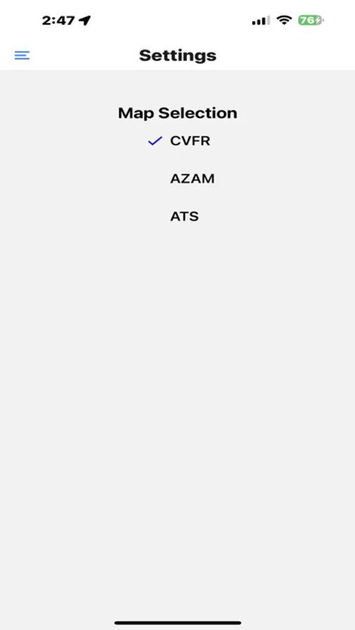 * Settings for Map Selection General Aviation CVFR , Light Sport Aircraft AZAM, ATS Map