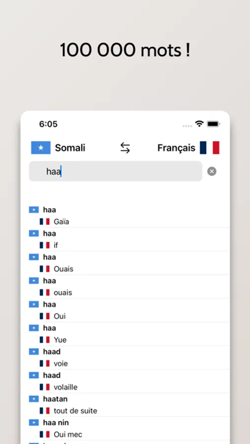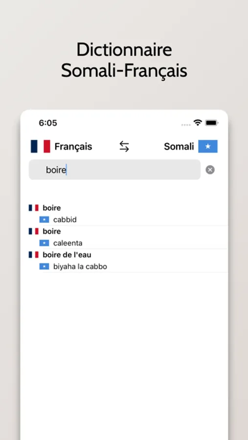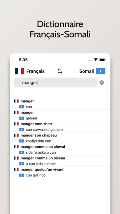 - Possibilité de rechercher à partir de mots en Français ou en Somali