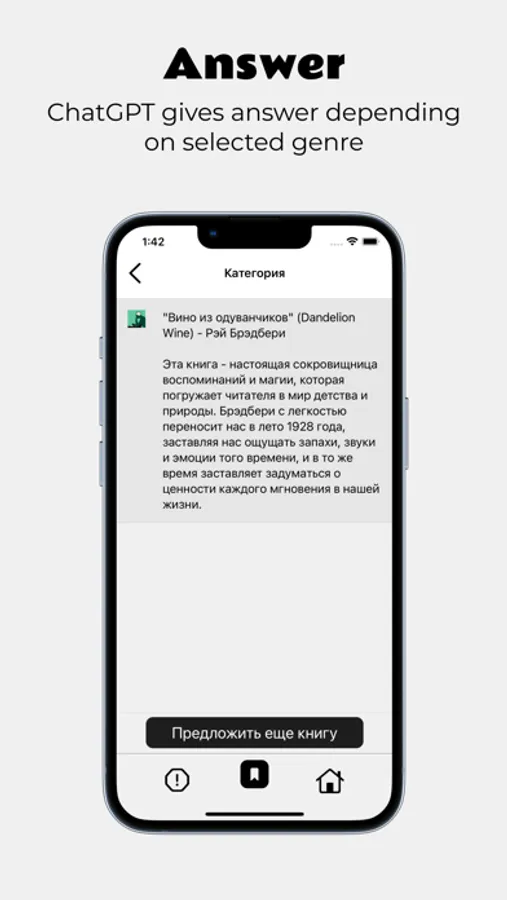 Используя передовую технологию искусственного интеллекта, приложение анализирует ваш текст об авторе и книге для чтения, чтобы генерировать персонализированные рекомендации по книгам.