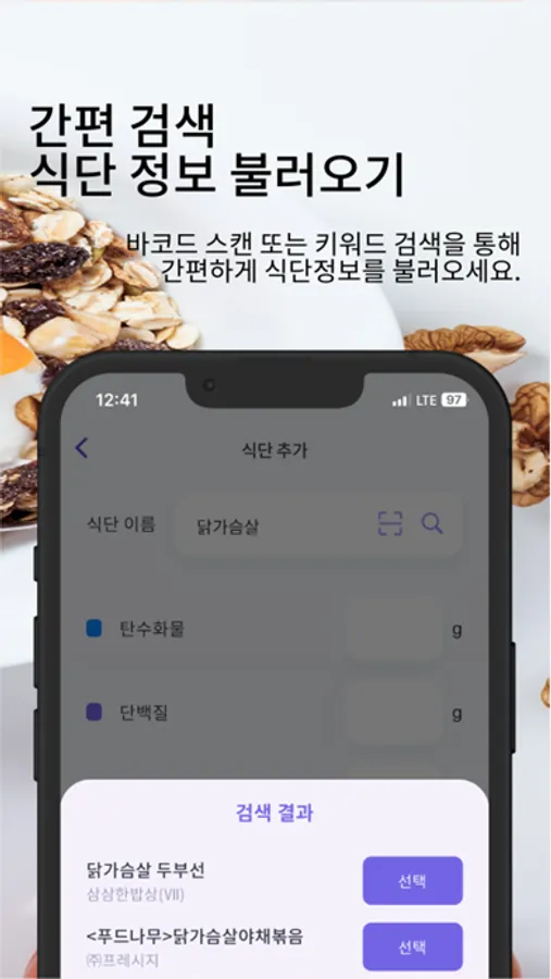 바코드 스캔으로 간편한 식단 검색: 제품의 바코드를 스캔하여 영양 정보와 성분을 손쉽게 확인하세요.