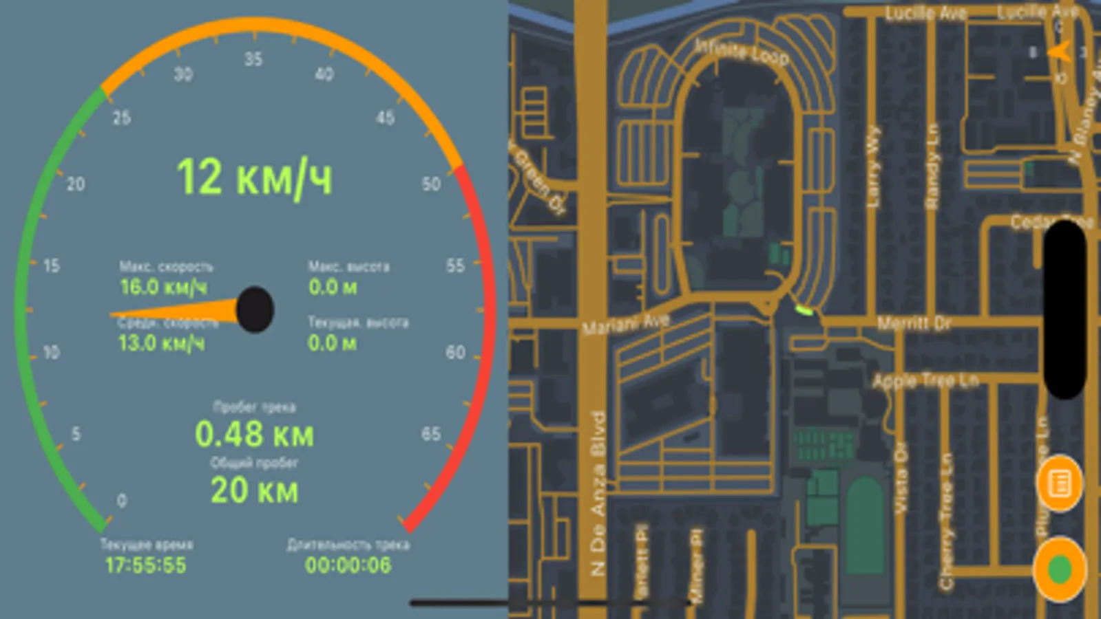 Отображение визуального спидометра и карты, а так же максимальных, средних и минимальных значений высоты, скорости, времени трека
