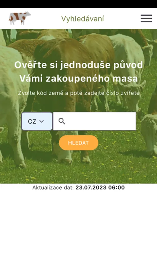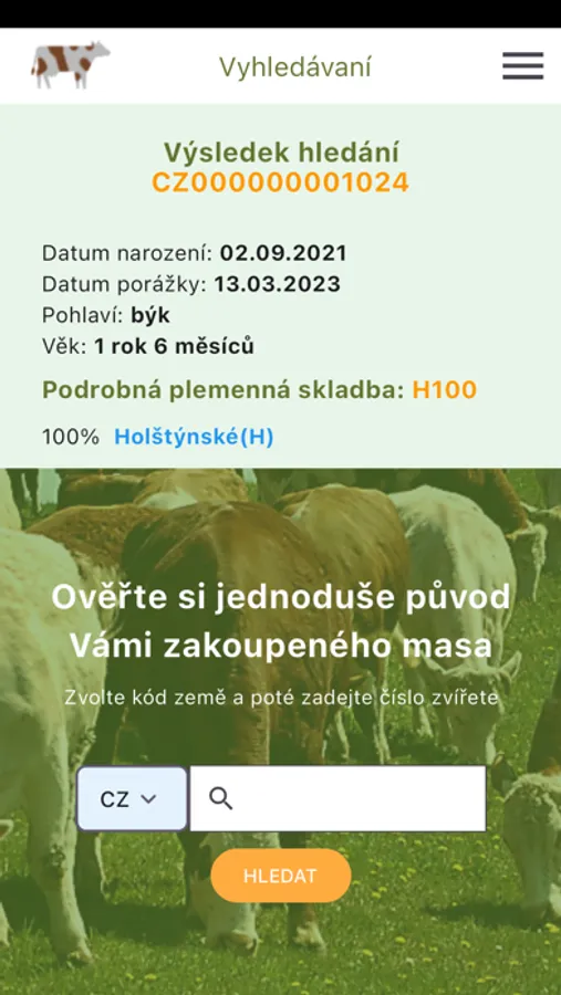 Po zadání ušního čísla zvířete (kód země a číslo), uvedeného na etiketě zakoupeného zboží či v prostoru prodejny, získáte následující informace: