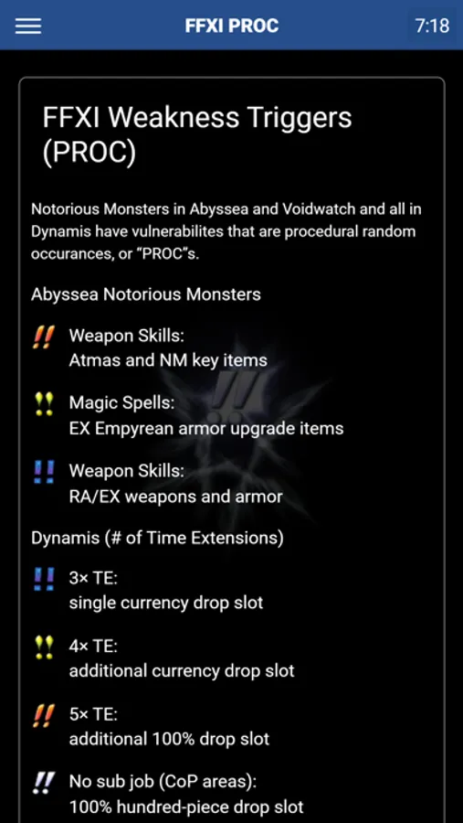Final Fantasy XI weakness trigger (or PROC) guide for Abyssea, Dynamis, and Voidwatch notorious monsters. Easily reference weaponskills, magic spells, ninjutsu, bard songs, and job abilities to trigger red, yellow, and blue PROCs.