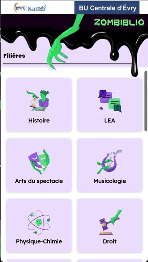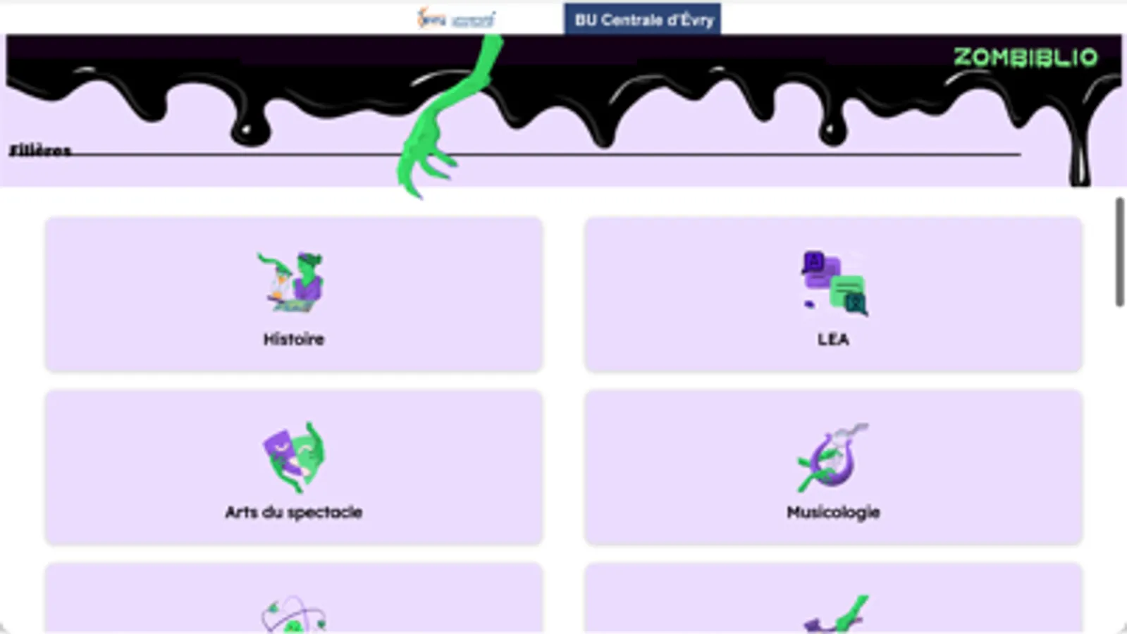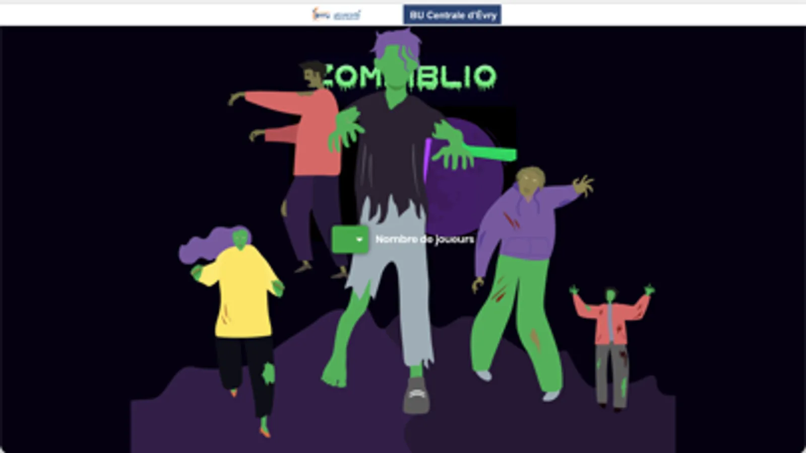 L’objectif du jeu Zombiblio BU Evry est de faire découvrir, sur tablette ou smartphone, la bibliothèque de campus aux étudiants primo-arrivants (première année de licence ou d’IUT), pour le réseau de Bibliothèque Universitaire de Paris-Saclay.