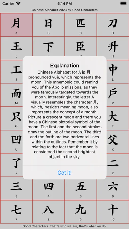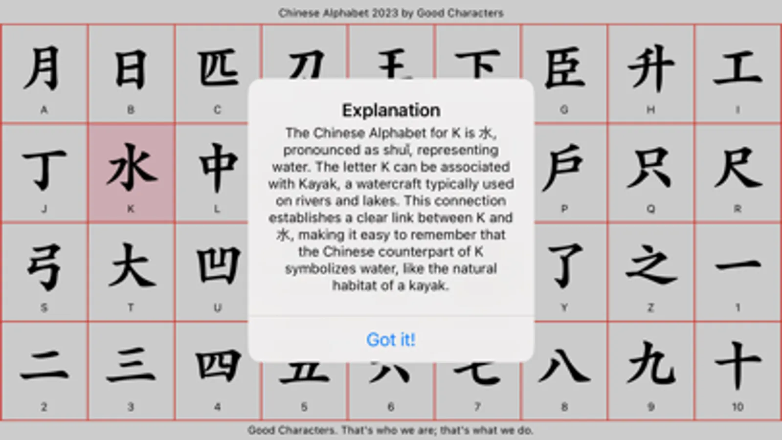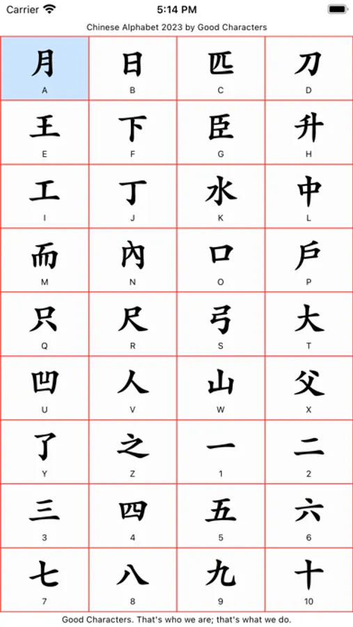 The purpose of this app is very simple. It is to be your quick reference for Good Characters’ Chinese “Alphabet” set. Simply touch the app icon and you’ll see a full set of “alphabet” characters.