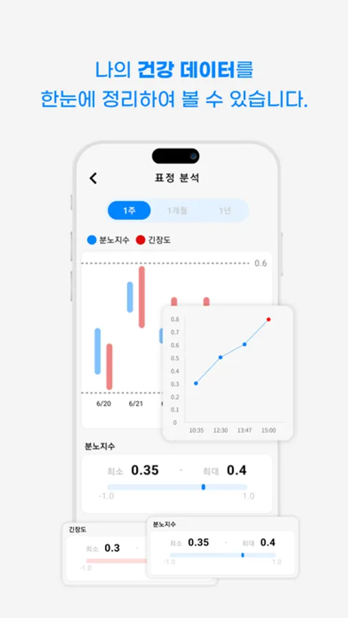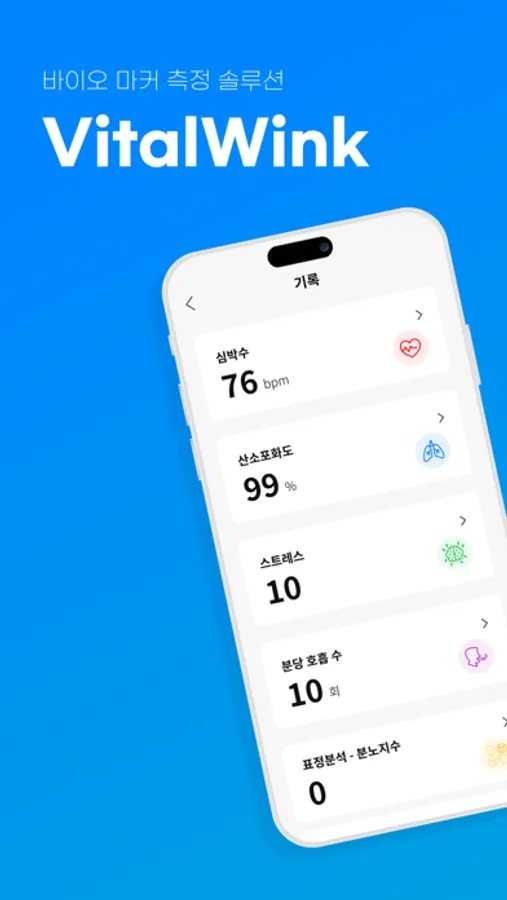 1. 전면 카메라를 통해 얼굴 영상 혹은 후면 카메라를 통해 손가락 연상에서 심박수, 스트레스 정도, 분당 호흡수, 표정 등을 분석합니다.