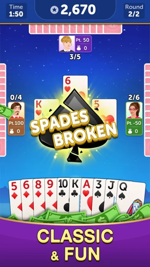 Spades Cash offers solo gameplay, allowing each player to earn individual points while competing against participants from around the globe in thrilling tournaments for lucrative cash rewards! The best part is, your gaming sessions will remain uninterrupted as we ensure an ad-free environment! Don't hesitate - download the game now and unleash your skills to compete for some serious CASH!