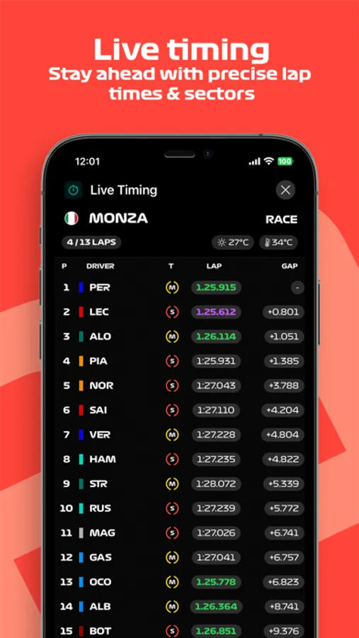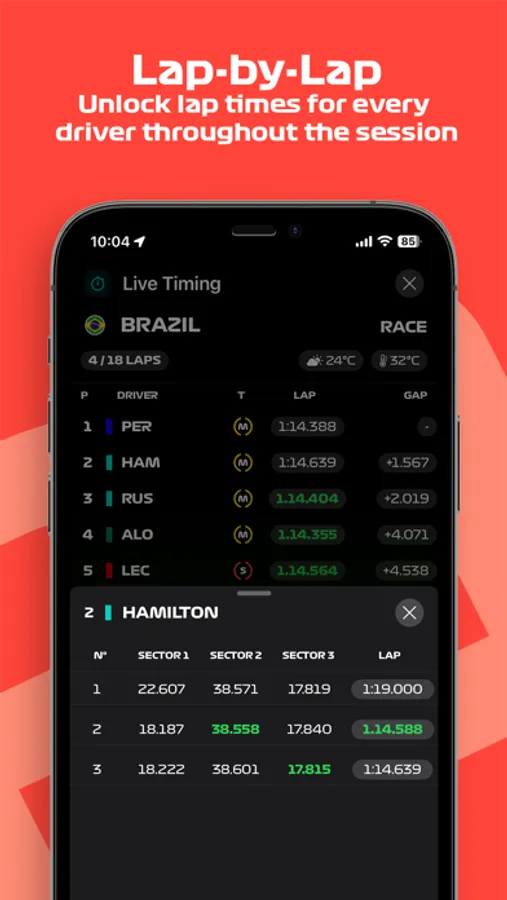 - Live Timing: Keep your finger on the pulse of the race with our real-time leaderboard. Monitor driver and team standings, and experience the thrill of the competition unfolding right before your eyes. You can now access the lap history of each driver during the session. Dive deep into their performance data.