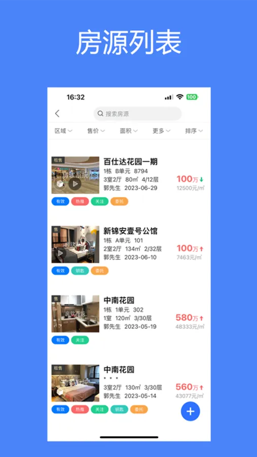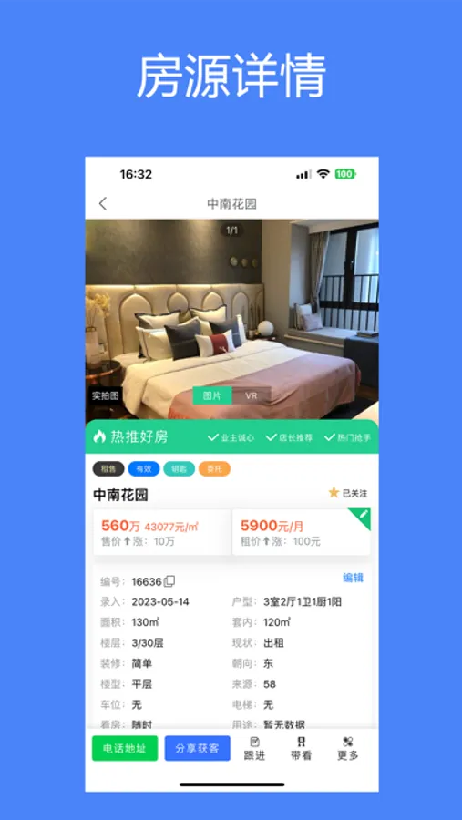 同时,我们提供了丰富的功能,包括房源状态、写跟进、业主加密、楼栋地址加密、房源带看、热推好房、房源日志、房源图片、房源视频、广告打印等,