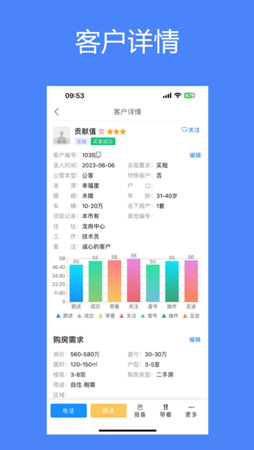 强大的客户分析功能,历史的跟进、成交、带看、关注、查号、操作、足迹,让你的客户管理更加有序,客户功能方面,可以多个电话、客户要求买或租、