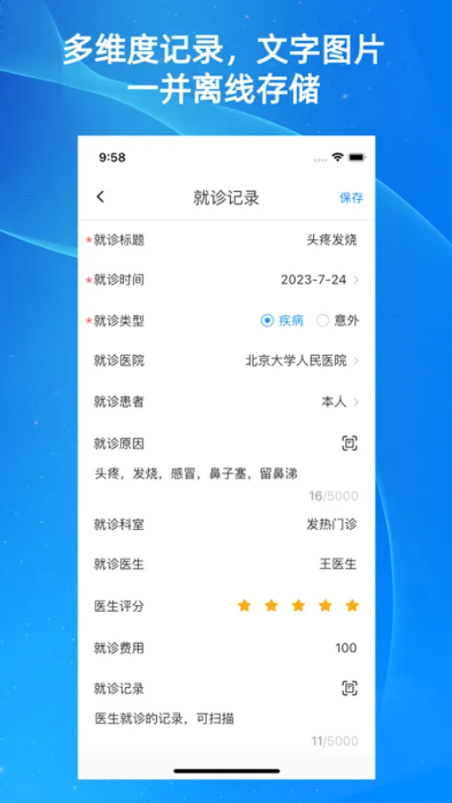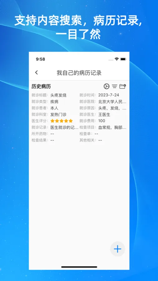 总之,我们的软件是一款功能全面、易于使用的病历记录应用程序。无论您是需要记录自己的病历,还是希望更好地管理您的医疗信息,我们的软件都能满足您的需求。立即下载并体验我们的软件,让您的病历记录变得更加简单和方便!