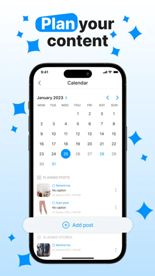 Content Planning: Organize your posts, stories, and more with our intuitive content planner. Visualize your feed and make changes in real-time.