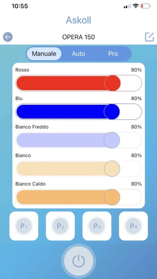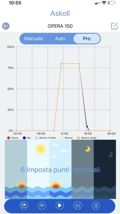 Askoll LUX permette di gestire e programmare dell’impianto di illuminazione degli acquari Askoll di nuova generazione. Dotata di tre modalità: Manuale - Auto - PRO, permette il controllo e la personalizzazione di tutti i canali di colore in modo indipendente. Le numerose configurazioni preimpostate consentono molteplici regolazioni (alba, giorno, tramonto, notte…)
