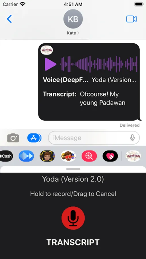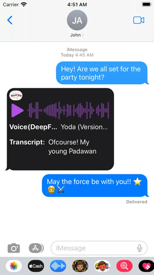Discover Mock’EM, the ultimate iMessage extension app that revolutionizes digital conversations with its boundless fun and excitement! Seamlessly merging state-of-the-art technology with unparalleled creativity, Mock’EM empowers you to unleash your imagination through voice recording or text input, magically converting them into a wide array of captivating deep fake voices. Whether it's channeling a beloved celebrity or embodying an iconic character, Mock’EM has you covered! Engage in uproarious exchanges with friends as you share voice messages that elicit laughter, surprise, and sheer amusement. With its user-friendly interface and an impressive selection of realistic and top-notch deepfake options, you'll always find the perfect voice to match your mood. Moreover, Mock’EM places significant emphasis on responsible usage, nurturing respectful communication, and forging stronger connections among users. So, why wait any longer? Elevate your iMessage experience to new levels of enjoyment and hilarity with Mock’EM today!