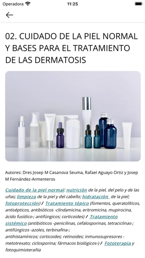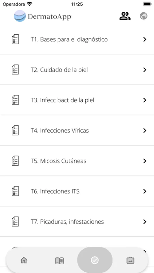 En la aplicación hemos desarrollado 18 temas que cubren el 100% de las materias dermatológicas de la licenciatura de medicina. Están organizados en diagnóstico dermatológico; cuidado de la piel normal; infecciones bacterianas de la piel y de los tejidos blandos; infecciones víricas; micosis cutáneas; infecciones de transmisión sexual; picaduras de insectos, infestaciones e infecciones por protozoos; dermatosis vesiculosas y ampollosas; dermatosis eritematodescamativas; dermatitis o eczemas; dermatosis reactivas; discromías; alopecias y enfermedades comunes de las uñas; patologías de las glándulas sebáceas y sudoríparas; tumores cutáneos benignos, tumores y hamartomas vasculares; lesiones premalignas y carcinomas de los queratinocitos; tumores melanocíticos: nevos y melanomas; y manifestaciones cutáneas de las enfermedades internas.