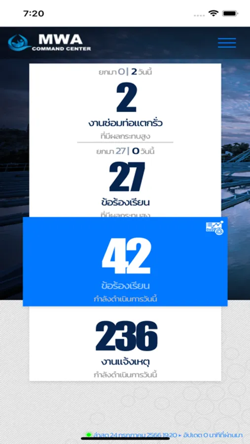 MWA Command Center เป็นแอปพลิเคชันที่สร้างขึนเพื่อ บริหารสถานการณ์การให้บริการน้ำประปา โดยควบคุม ตรวจสอบ และติดตามงานที่ส่งผลกระทบต่อผู้ใช้น้ำให้เป็นไปตามมาตรฐานของการบริการ เพื่อแก้ไขปัญหาความเดือดร้อนของประชาชนอย่างมีคุณภาพและประสิทธิภาพสูงสุด