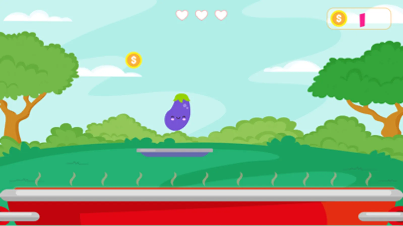 Move the eggplant tray so that it bounces on the gold coins and at the same time so it doesn't fall onto the on-board induction hob.