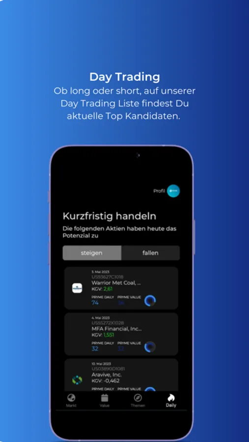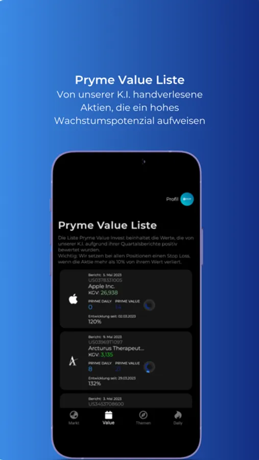 Möchtest du dein Trading optimieren und suchst nach soliden Strategien? Mit Pryme Financial erhältst du dank unserer einzigartigen K.I.-Technologie fundierte Anlageideen basierend auf den aktuellsten Quartalsberichten. Ob Neuling oder Profi, unsere App liefert dir zuverlässige Listen von Aktien, die unsere K.I. für vielversprechend hält.