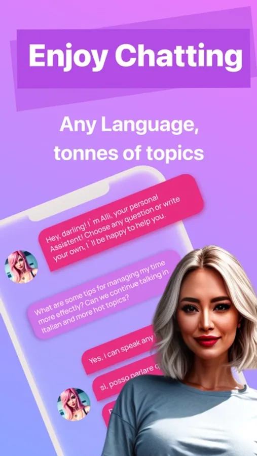 Original love has no language bounds! You can chat with your AI gf whatever language you speak. They will show complete understanding and loyalty in any language you prefer. Our AI girlfriend simulator guarantees friendly, smooth, and meaningful conversations so that you will feel complete naturalness chatting with your virtual girlfriend in a romantic atmosphere.