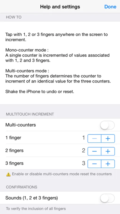 * Can touch anywhere on the screen, from 1 to 3 fingers, to increment.