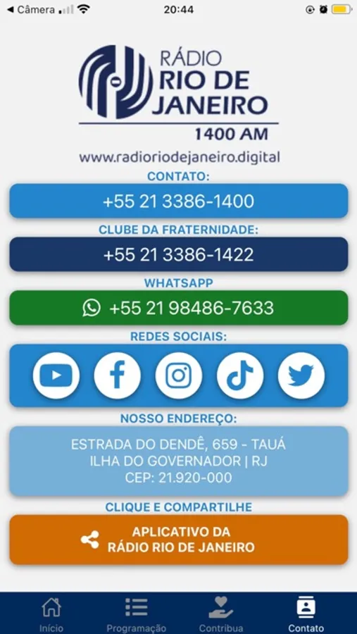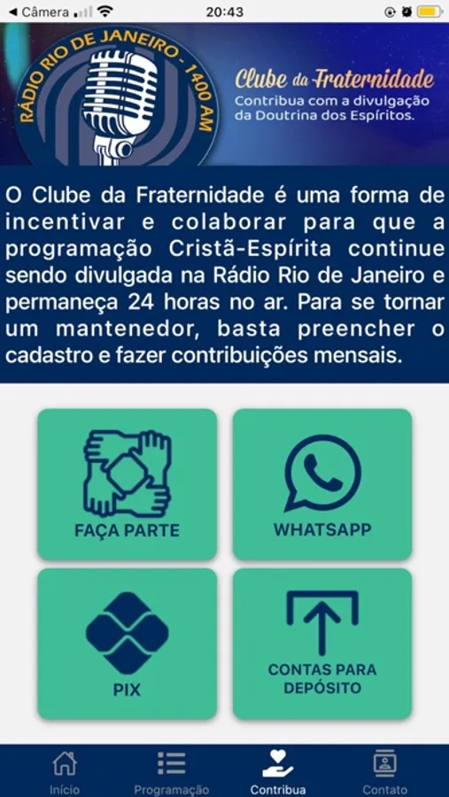 No app da Rádio Rio de Janeiro Oficial, você pode ver e ouvir a Emissora da Fraternidade, saber detalhes da programação da Rádio, se inscrever no Clube da Fraternidade e ainda ficar por dentro das novidades da Rádio que toda família pode ouvir!