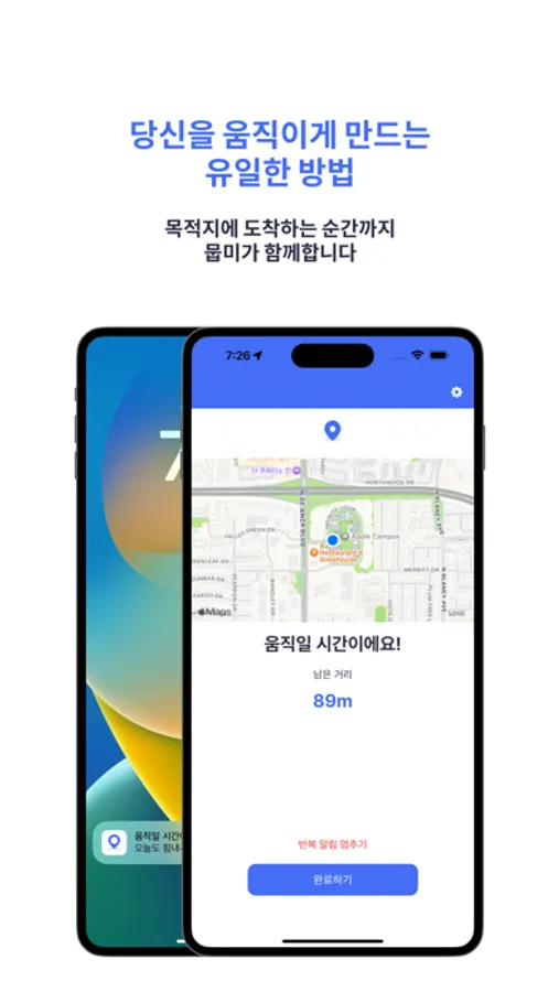 뭅미는 위치 기반 알람 서비스로 알람을 해제하기 위해서는 설정 당시 저장한 위치에 도착해야 합니다.