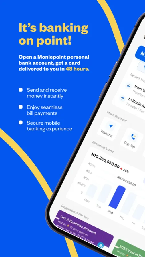 1: Send and Receive Money with Ease: With Moniepoint, you can effortlessly send and receive money instantly. Say goodbye to the hassles of traditional banking and enjoy instant and secure transfers at your fingertips. No queues, no paperworks, instant alert notification.