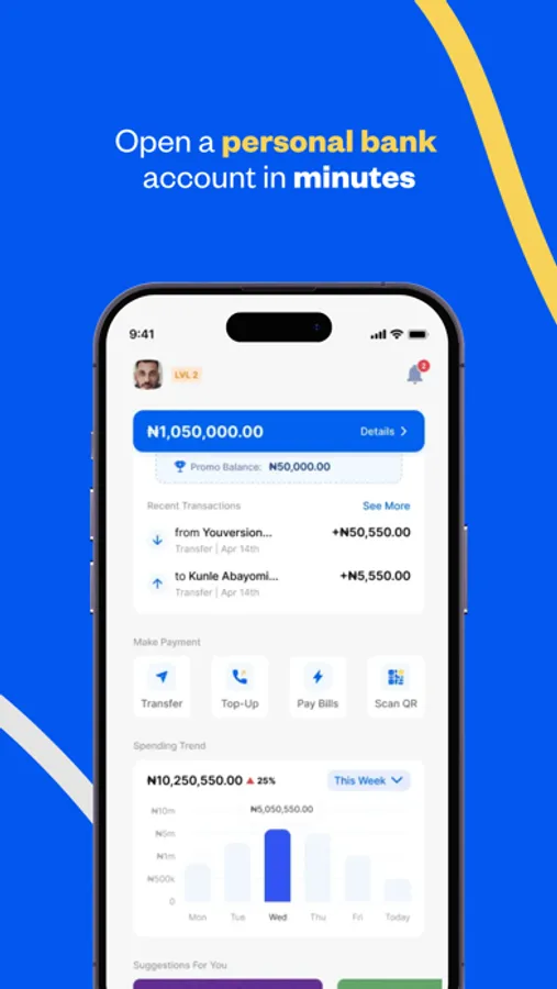 Open a functional bank account in minutes right from your phone. Send and receive money instantly, pay bills, buy airtime and data, conveniently from your mobile phone