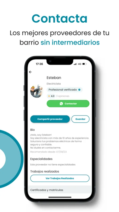 Puedes abrir cada perfil, conocer al proveedor, ver sus trabajos en detalle y contactarlo directamente, sin intermediarios.
