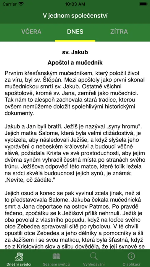 Tato aplikace je elektronickou verzí knihy V jednom společenství, která obsahuje biografie svatých pro každý den roku.