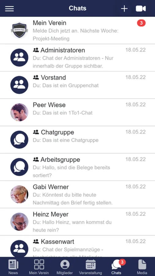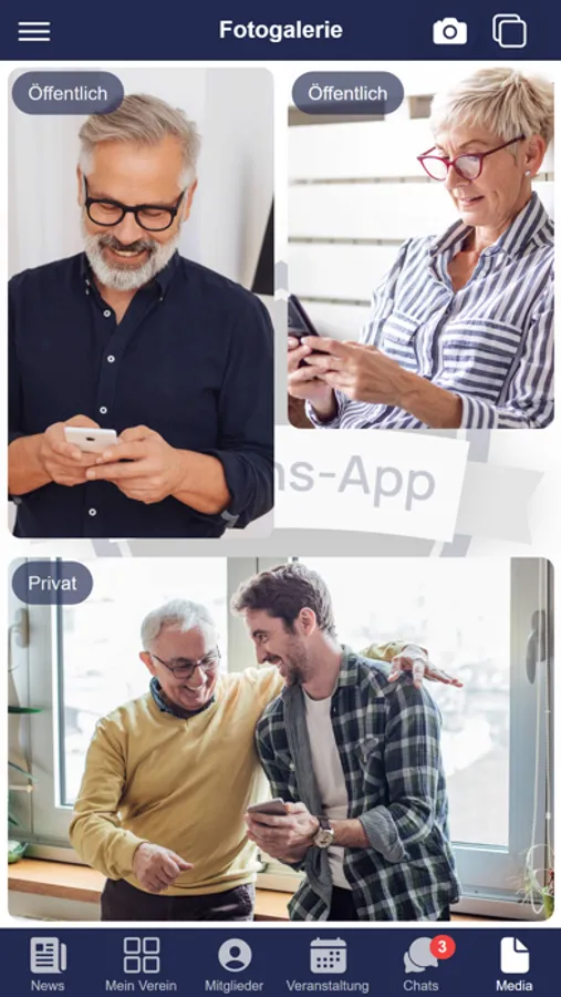 Organisieren Sie Ihr Vereinsleben vollumfänglich digital: Kommunikation von Neuigkeiten und Mitgliederzeitschriften, Verwaltung aller Mitgliederdaten, Erstellung von Projektgruppen, Organisation von Veranstaltungen mit Zu- und Absagen, Einzel-, Gruppen und Organisations-Chat, Bereitstellung von Dokumenten, öffentliche Fotopinnwand und vieles mehr ...