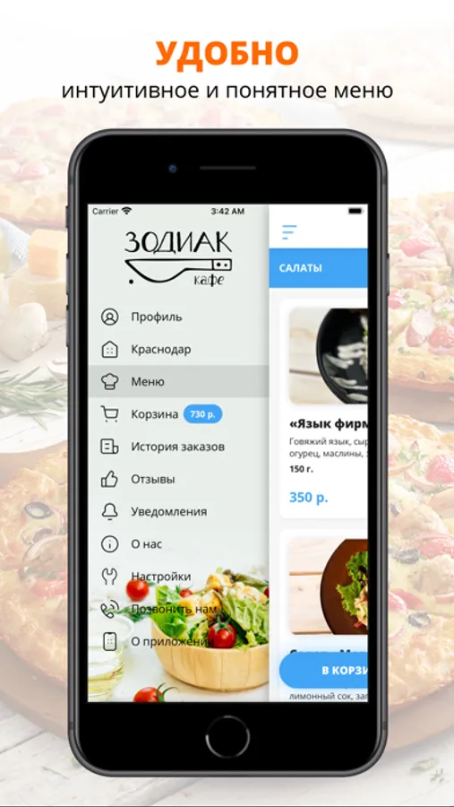 Приложение «Зодиак» — это удобный способ заказа еды домой или в офис! Мы готовим наши блюда из качественных свежих ингредиентов и доставляем еду быстро и бережно.