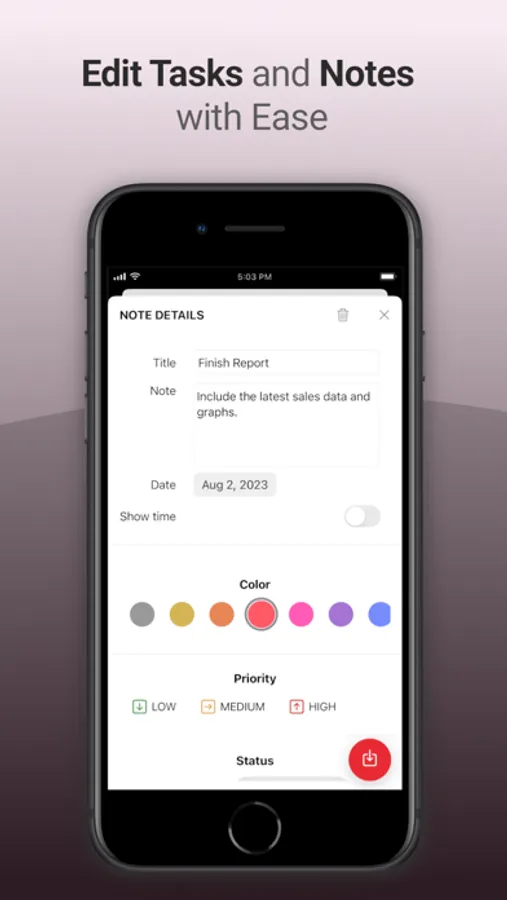 - Swift Task Status Updates: change task statuses (Not started, In progress, Completed, On hold, Cancelled) with a simple swipe in the task list
