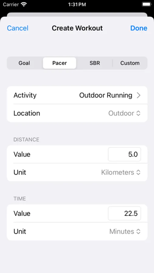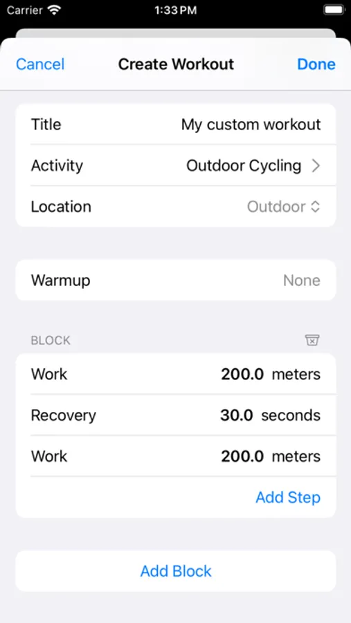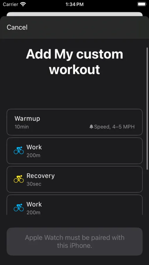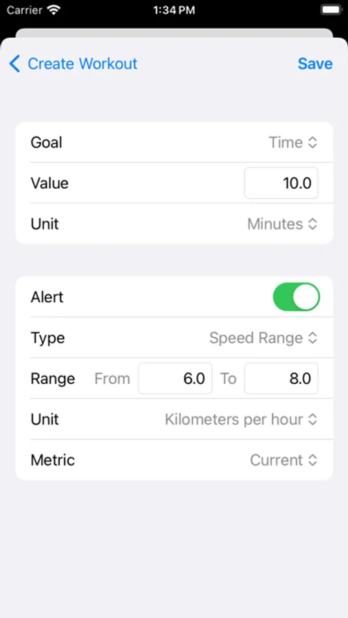 - or you can create your own workout with alerts and many options to customize (warmup 10 minutes, run 500 metres 8-10mph, run 300 metres 6-8 mph, repeat 5 times, cooldown 10 minutes)