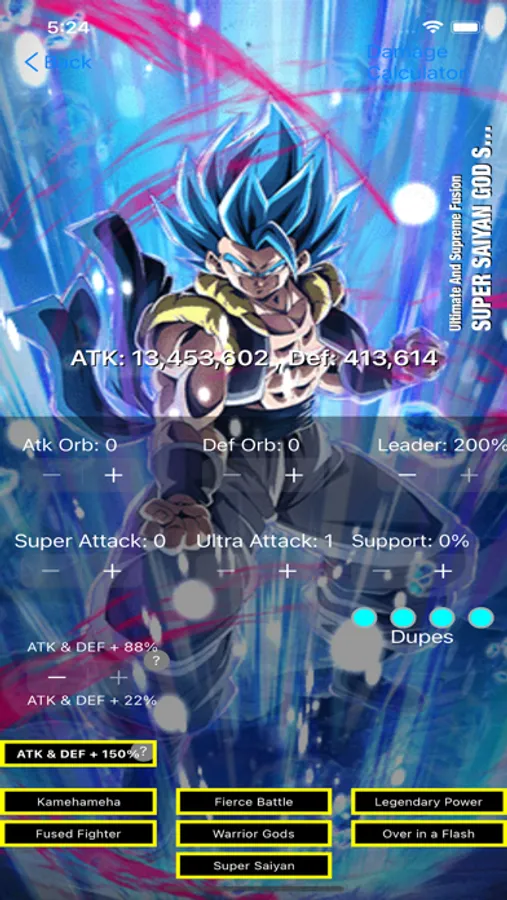 A mobile app for automatically calculating the attack and defense stats for hundreds of Dokkan Battle Characters! No manual entry of stats required by you. Just enter the name of the character you want to know more about and let the calculator take care of the rest! No more waiting for the APT guys to do their calculations and post them when a new character's information drops: New characters are added to this database as soon as their details are announced. All you have to do is search their name! Customize the situation to see a character's stats in different situations (e.g. with certain links not active, certain parts of their passive not active, defense after stacking a few supers, support, and much more)!